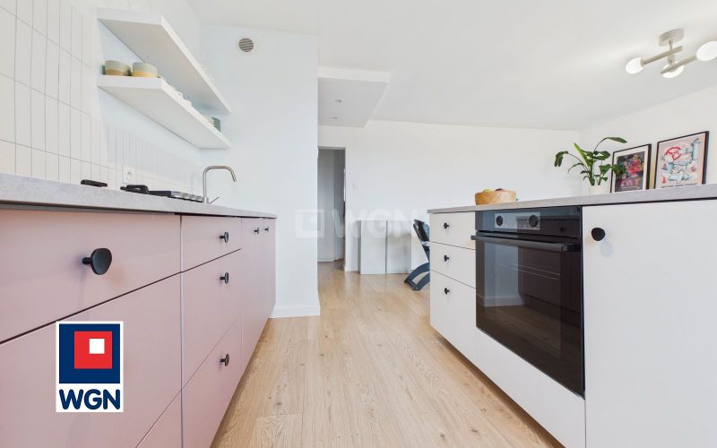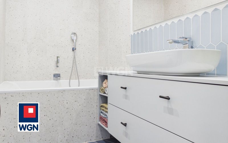 Jednym z wielu atutów mieszkania jest nowoczesna łazienka zaprojektowana z myślą o komforcie i estetyce. W pomieszczeniu znajduje się wygodna wanna z funkcją prysznica, co zapewnia elastyczność użytkowania. Zabudowa meblowa z pojemnymi szufladami oraz otwartymi półkami umożliwia praktyczne przechowywanie. Na blacie umieszczono nowoczesną umywalkę nablatową z designerską armaturą. Łazienka została również wyposażona w pralkę, co czyni ją w pełni funkcjonalną i idealnie dostosowaną do codziennych potrzeb.
