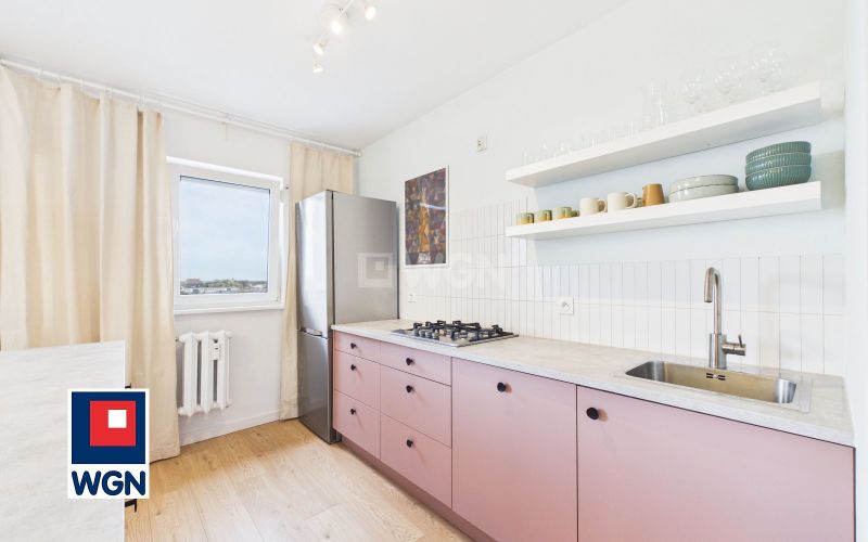 Zabudowa kuchenna jest prosta i funkcjonalna. Dolne szafki oferują dużo miejsca do przechowywania między innymi jest tu zmywarka Samsung, a otwarte półki nad blatem dodają wnętrzu nowoczesnego charakteru. Na blacie znajduje się płyta gazowa Whirlpool oraz zlewozmywak z elegancką baterią. Całość uzupełnia wolnostojąca lodówka Sharp w kolorze stali.